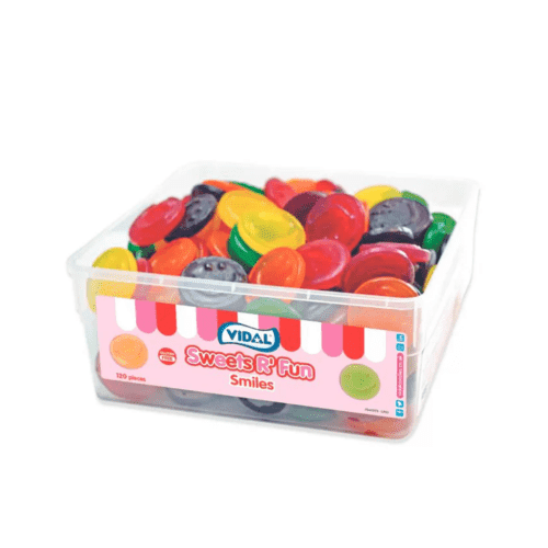 An assortment of colourful fruit flavoured jelly sweets in the shape of a smiley face. 120 count. Gluten Free.